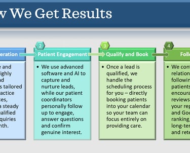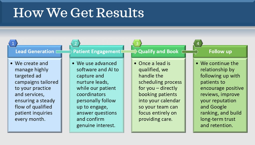 Our marketing system is designed to increase your patient bookings and generate revenue.  We don't just give you leads, we do everything for you -- from advertising to engaging with patients, using leading technologies to book qualified patients directly on your calendar.